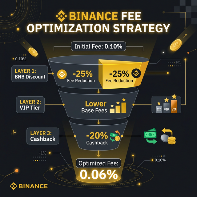 Binance fee optimization is straightforward: BNB discount (25%) + cashback (20%) + limit orders = up to 45% reduction in trading costs. For a trader with $100,000/month volume, this translates to $400-500 in annual savings with zero effort after initial setup.