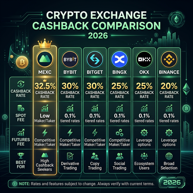 | Maximum cashback % | MEXC | 32.5% β highest available |
