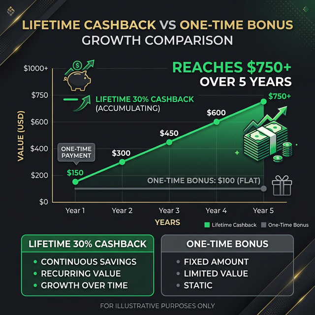 A lifetime 30% cashback program generates 30x more value than a one-time $50 signup bonus over 10 years. Even compared to a generous 90-day 50% promotion, lifetime cashback delivers 12x more total savings.